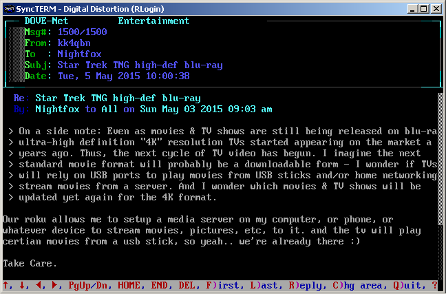 Synchronet. The reader interface allows scrolling the message up & down,