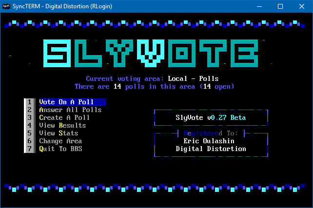 SlyVote is a voting booth door for Synchronet 3.17+ that allows users to post and vote on poll